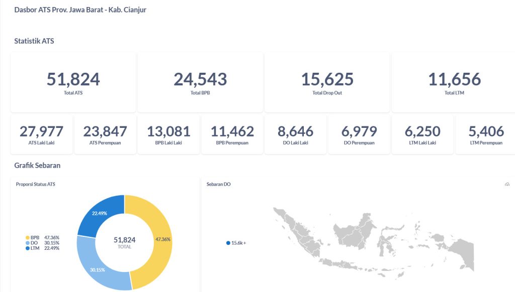 RUANGPOJOK.COM – Jumlah Anak Tidak Sekolah (ATS) di Kabupaten Cianjur melonjak menjadi 51.824, berdasarkan dashboard Verval ATS Kementerian Pendidikan Dasar dan Menengah per tanggal 22 Desember 2025.