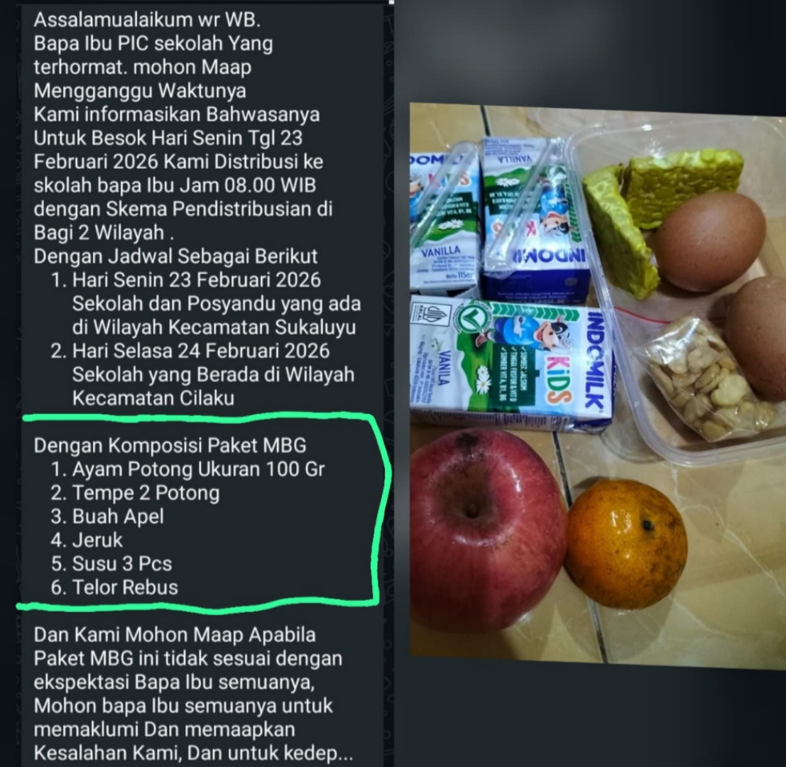 Keluhan serupa muncul di Kecamatan Cilaku. Salah satu orangtua menyebut menu yang diterima siswa berbeda dengan hasil sosialisasi awal kepada guru.