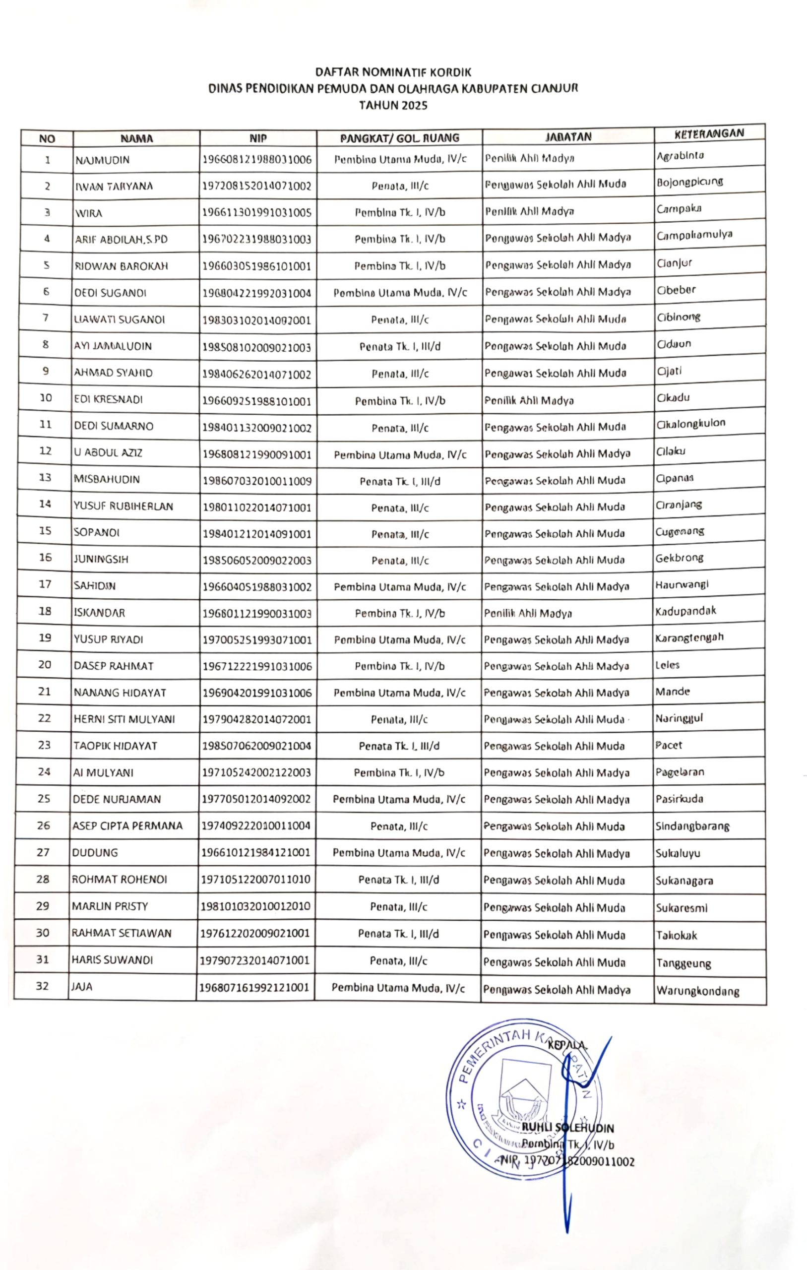 RUANGPOJOK.COM – Dinas Pendidikan Pemuda dan Olahraga (Disdikpora) Kabupaten Cianjur mengganti sejumlah Koordinator Pendidikan (Koordik) pada 17 April 2025.