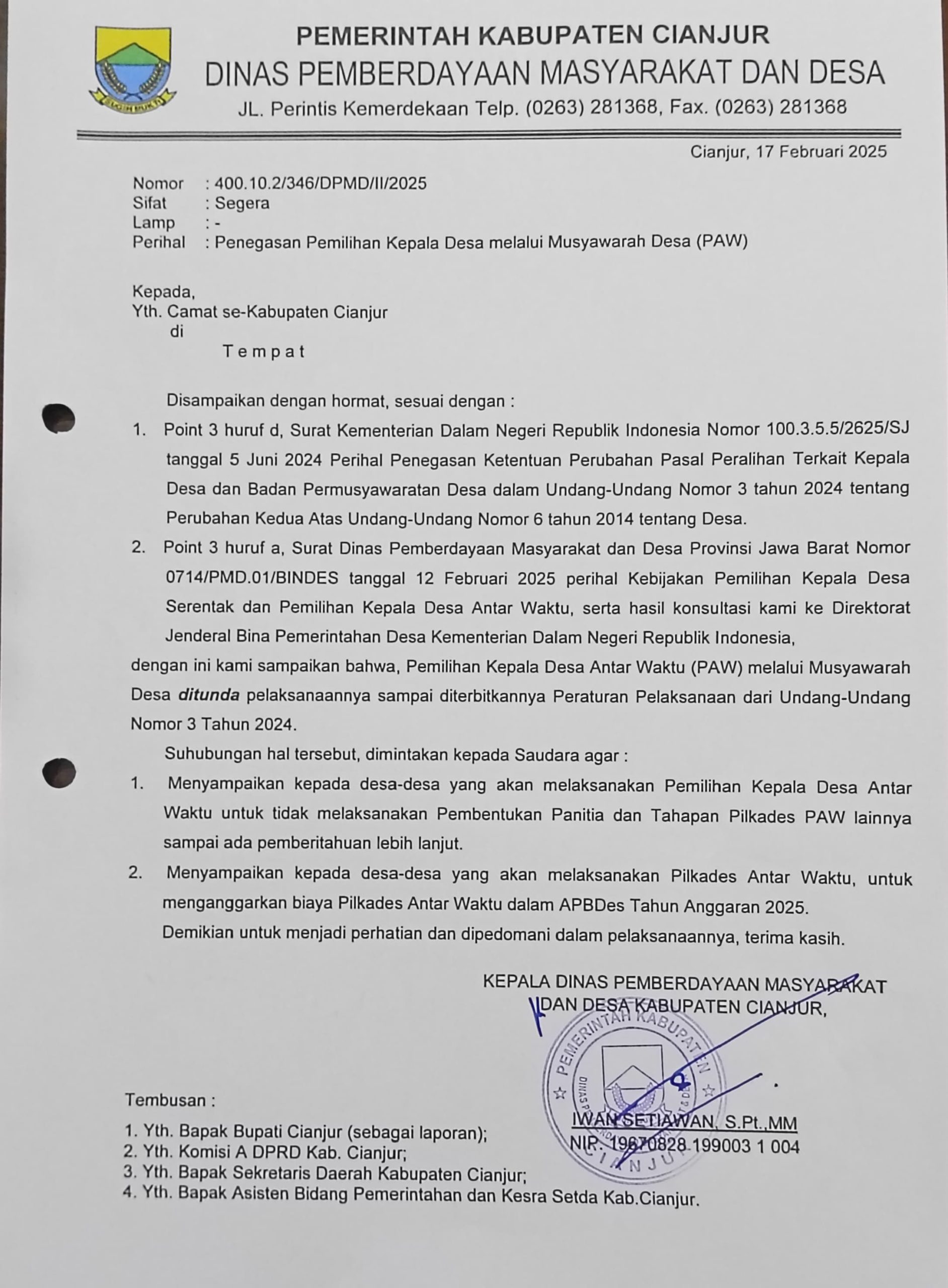 DPMD Cianjur menindaklanjuti surat edaran Kementerian Dalam Negeri (Kemendagri) sembari menunggu pemerintah menerbitkan Peraturan Pemerintah (PP) dan Peraturan Menteri Dalam Negeri (Permendagri) sebagai turunan UU No. 3 Tahun 2024 tentang Perubahan UU No. 6 Tahun 2014.