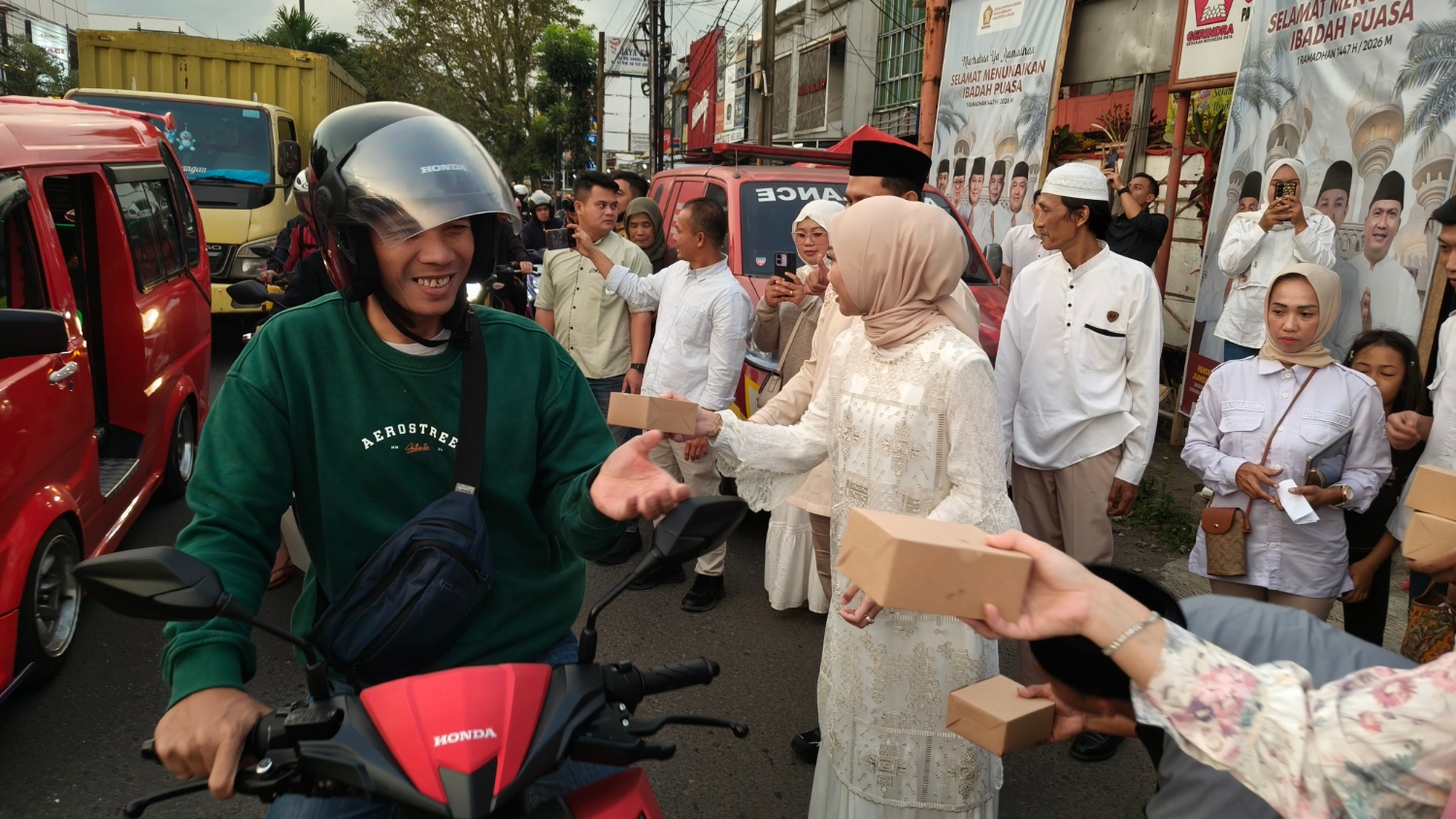 Sejumlah kader Partai Gerindra terlihat membagikan paket takjil kepada pengendara yang melintas di depan Kantor DPC Gerindra Cianjur menjelang waktu berbuka puasa.