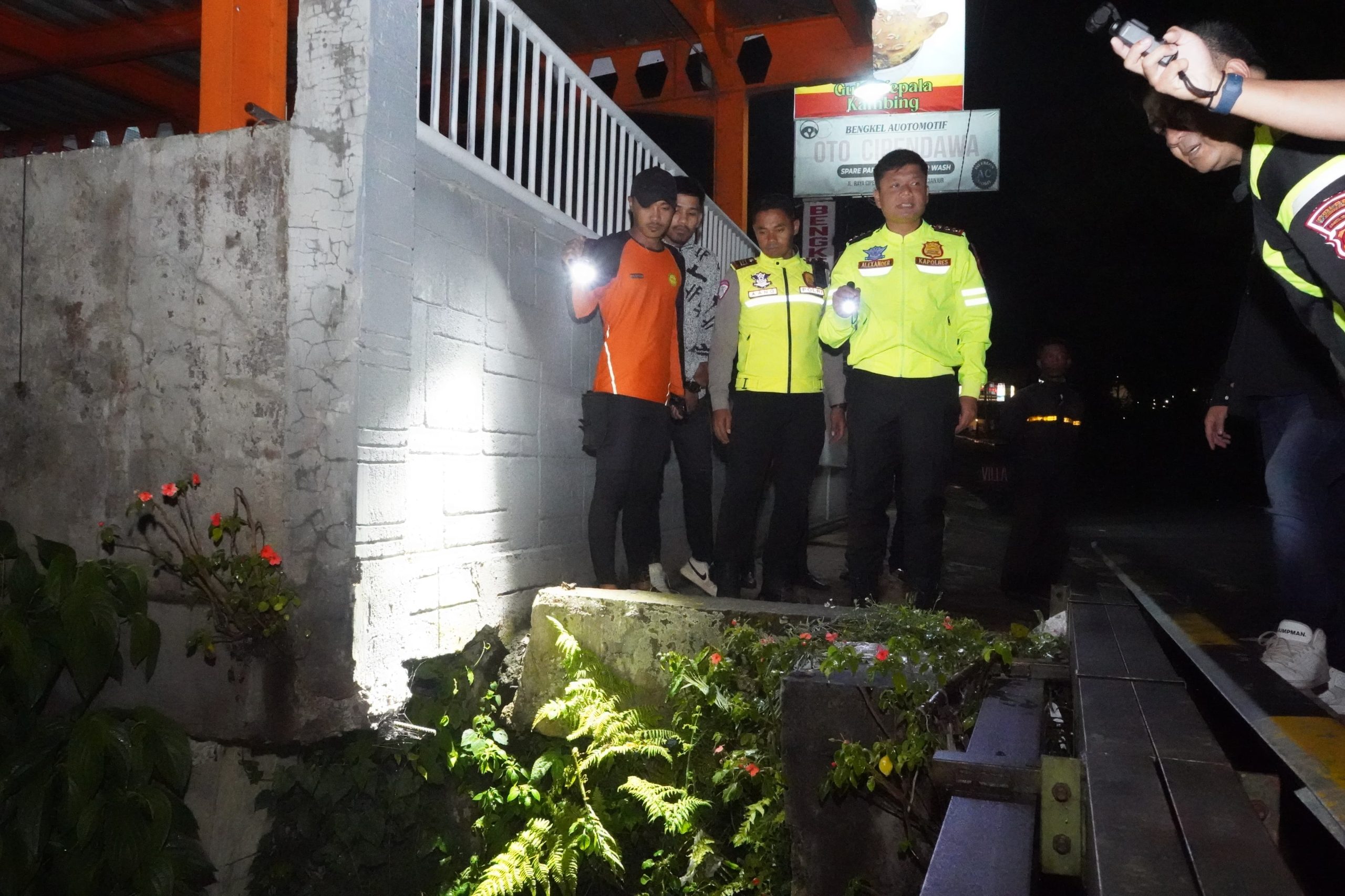 Gambar Istimewa: Kapolres Cianjur bersama tim Basarnas dan BPBD Cianjur meninjau lokasi kecelakaan sepasang pengendara yang terjatuh ke saluran drainase di Desa Cipendawa