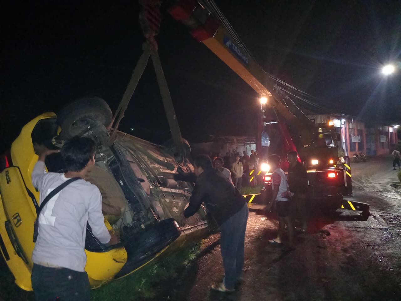 Beranda » Desa Kita » Mobil Honda Brio Tergelincir dan Terbalik Masuk Sawah di Karangtengah Cianjur, PJU Minim Diduga Jadi Penyebab