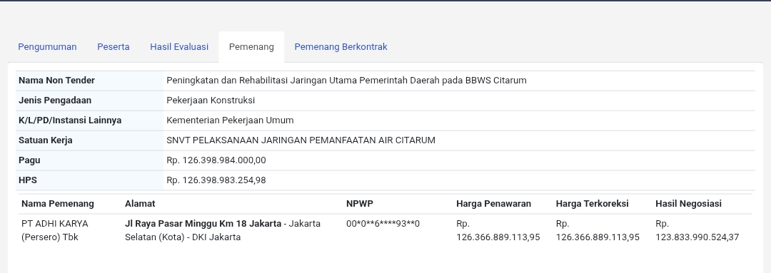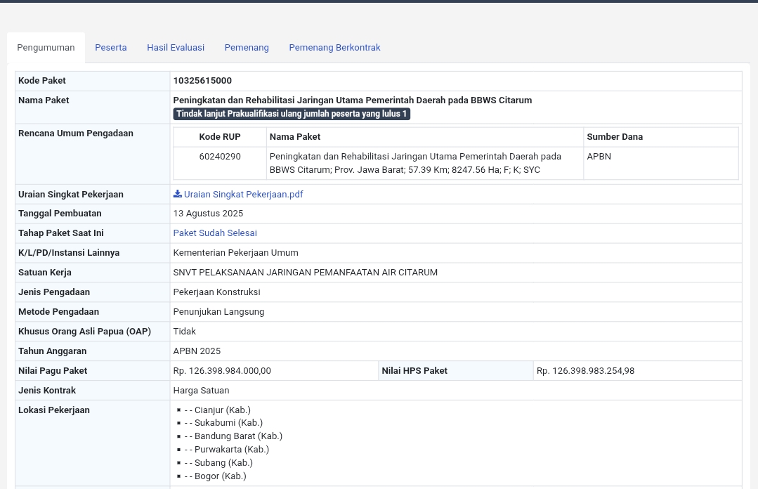Data Layanan Pengadaan Secara Elektronik (LPSE) mencatat proyek tersebut masuk dalam paket peningkatan dan rehabilitasi jaringan utama Balai Besar Wilayah Sungai (BBWS) Citarum, Jawa Barat.