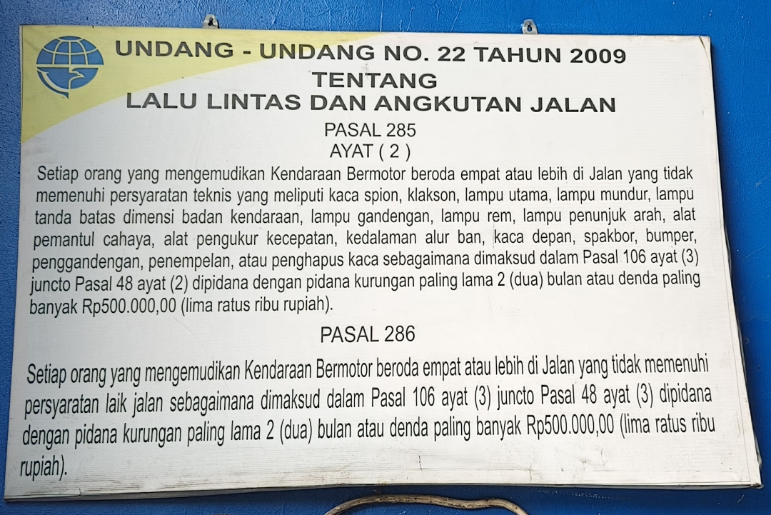 Selain itu, regulasi kendaraan juga mengacu pada Undang-Undang Nomor 22 Tahun 2009, Peraturan Menteri Perhubungan RI no 30 Tahun 2020 dan no 19 Tahun 2021, serta Peraturan Pemerintah Nomor 55 Tahun 2012.
