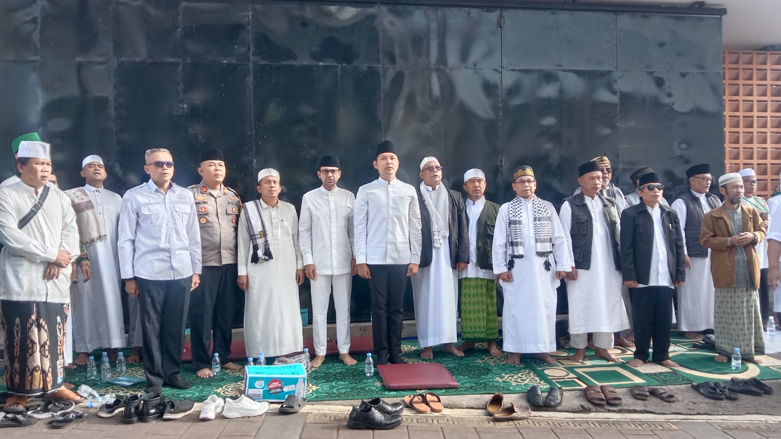 Wakil Ketua MUI Cianjur Ahmad Yani mengumumkan capaian donasi secara real-time di hadapan jamaah.