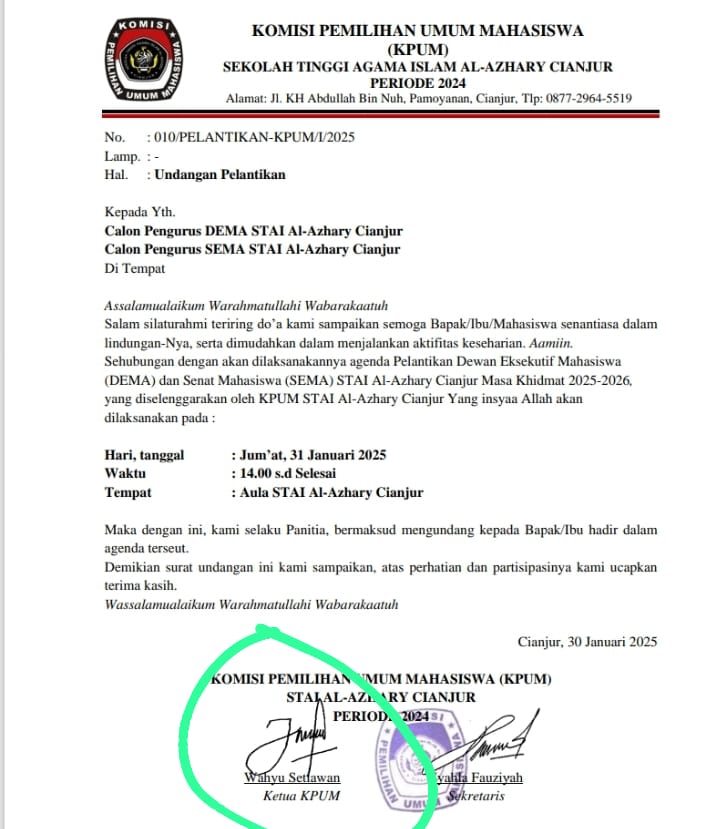 CIANJUR.RuangPojok.com – Ketua Komisi Pemilihan Umum Mahasiswa (KPUM) STAI Al-Azhary, Wahyu Setiawan, ancam laporkan tindakan pemalsuan tanda tangan dirinya ke kepolisian cianjur.