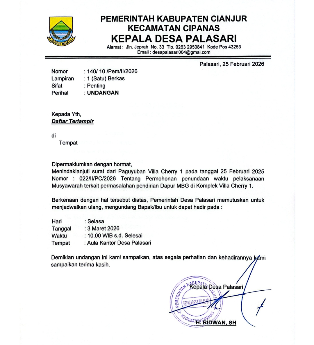 Pemerintah desa menggelar rapat bersama paguyuban warga pada Selasa, 3 Maret 2026, untuk membahas polemik tersebut.